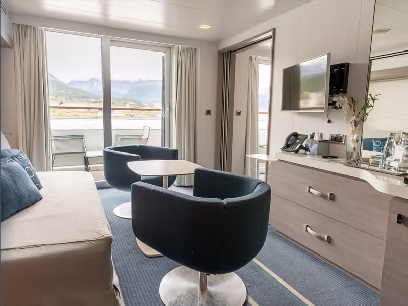 • A lounge with two armchairs, second TV, sliding courtesy door, and convertible sofa to a king-size bed (180 x 190 cm)