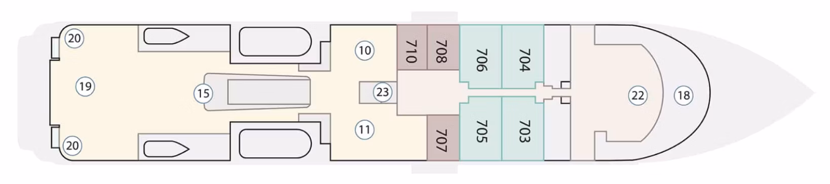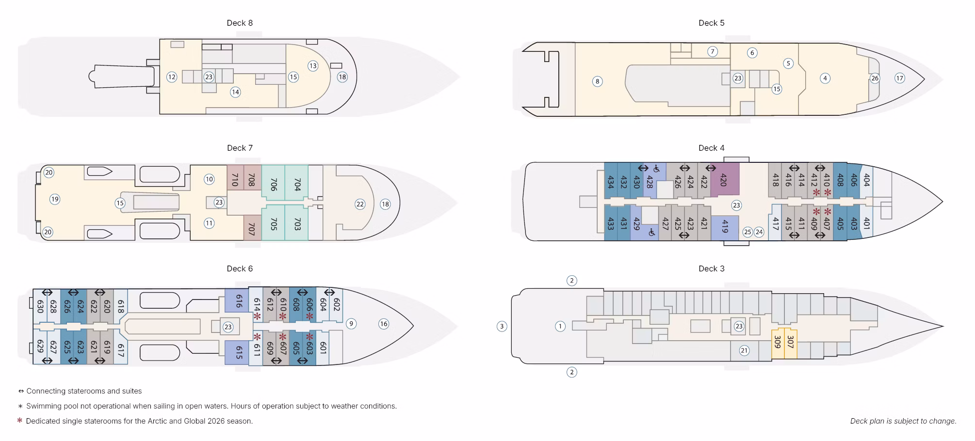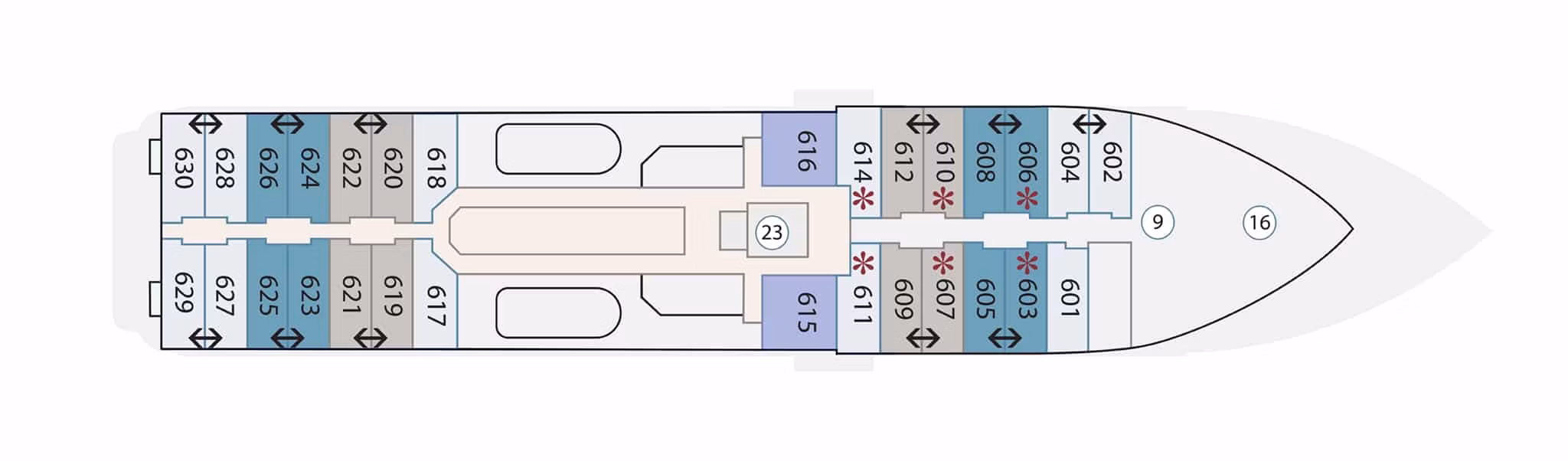 The Sylvia Earle Deck Plans can be viewed below in detail by clicking on any of the deck plan images for each deck. Prices may vary depending on the size and positioning of the cabins on the ship, as well as the sailing dates.